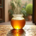 Sa texture épaisse et crémeuse offre une sensation en bouche remarquable. La couleur oscille entre l’ambre doré et le brun cuivré, tandis que son arôme dégage des effluves végétaux intenses qui évoquent immédiatement les paysages arides du Maroc.